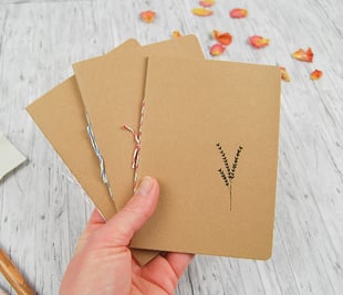 Recyclingpapiere, blanko oder dotgrid bedruckt, von Hand geheftet und zugeschnitten.